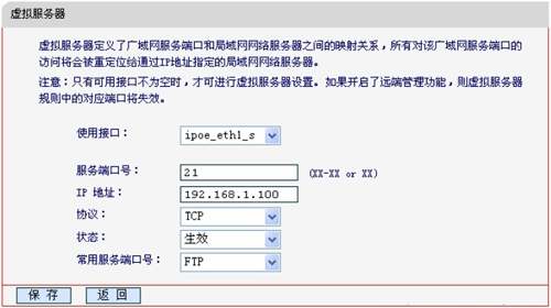 4、映射21端口:“服務端口號”后面填寫“21”——>“IP地址”后填寫192.168.1.100——>“協議”后面選擇TCP——>“狀態”選擇“生效”——>點擊“保存”。