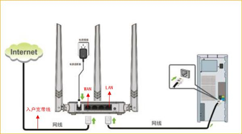 直接將入戶的網線接在路由器的WAN口,再找一根短網線,一頭接電腦,一頭接路由器1/2/3任意接口,接線方式如下圖: