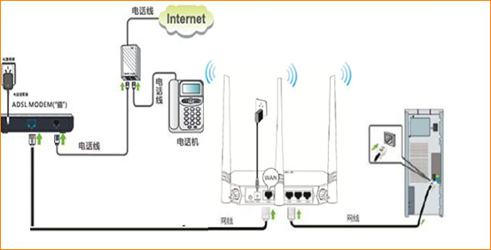 將電話線(比較細的那根線)接“貓”的line口(比較小的那個口),“貓”分出來一根網線接路由器的WAN口,再找一根短網線,一頭接電腦,一頭接路由器LAN1/LAN2/LAN3任意接口,接線方式如下圖: