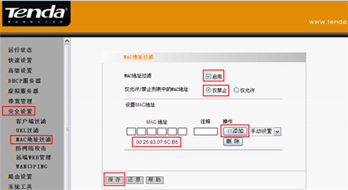 2、登陸路由器管理界面,點擊“安全設置”―“MAC地址過濾”,啟用MAC地址過濾,選擇過濾模式“僅禁止”/“僅允許”,輸入需過濾的MAC地址“添加”--“保存”,如下圖所示: