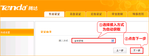 6、選擇接入方式“自動(dòng)獲取”點(diǎn)擊“下一步”