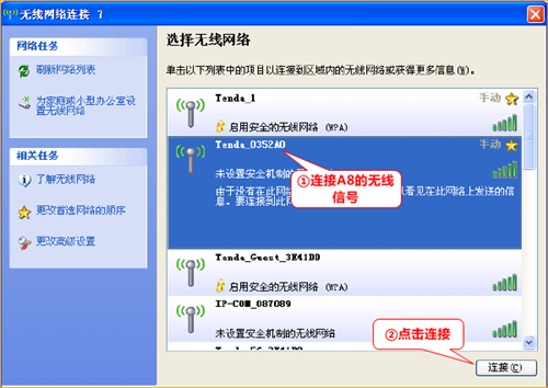 6、選中名為Tenda_XXXXXX的無(wú)線網(wǎng)絡(luò)(X為A8背面MAC地址的后六位),點(diǎn)擊“連接”