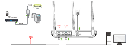 直接將入戶的網線接在路由器的WAN口,再找一根短網線,一頭接電腦,一頭接路由器1/2/3任意接口,接線方式如下圖: