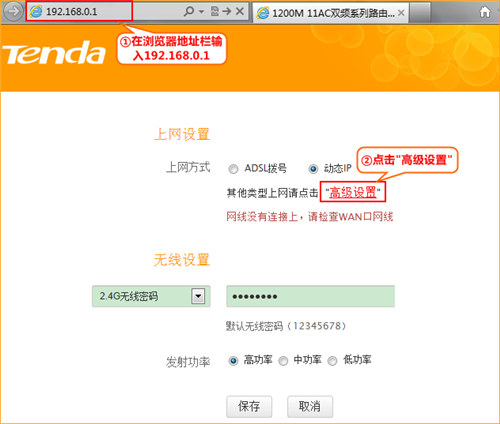 1、在瀏覽器中輸入:192.168.0.1 按回車鍵,在跳轉的頁面中點擊“高級設置”