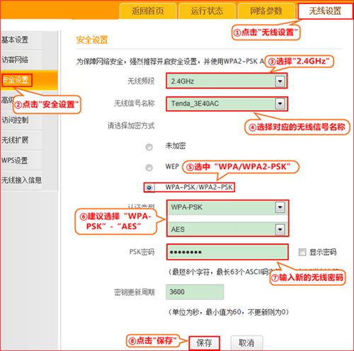 第二步:點擊“無線設置”-“安全設置”,可修改當前無線網絡的無線密碼
