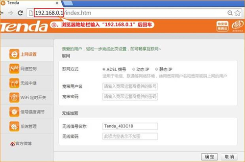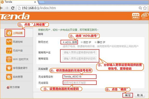 2、點擊“上網設置”,選擇聯網方式為“ADSL撥號”,輸入運營商提供的寬帶賬號及寬帶密碼,點擊“確定”,如下圖: