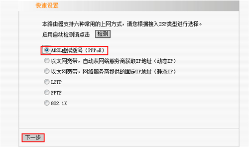 3、在隨后的頁面中選擇上網方式為“ADSL虛擬撥號(ADSL撥號)”點擊“下一步”。