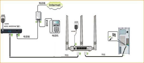 將電話線(比較細的那根線)接“貓”的line口(比較小的那個口),“貓”分出來一根網線接路由器的WAN口,再找一根短網線,一頭接電腦,一頭接路由器LAN1/LAN2/LAN3任意接口,接線方式如下圖: