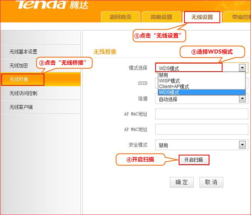 登陸第一臺路由器管理界面192.168.0.1,點擊“無線設置”—“無線基本設置”選擇“無線橋接”,開啟掃描到第二臺路由器的MAC,如下圖所示 :