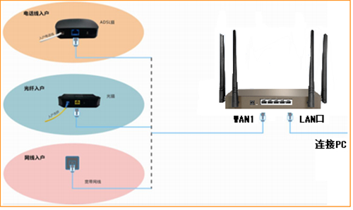 從外網接一條網線進來到路由器WAN口上,再從路由器上面LAN口分出一條網線連接到電腦上,如下圖所示: