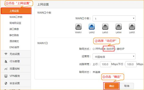 ②如果你是動態IP上網的用戶,聯網方式選擇“動態IP”,選擇您使用的運營商,在“線路帶寬”處填寫運營商提供的上行與下行帶寬,然后輸入申請的帶寬后點擊“確定”即可聯網;