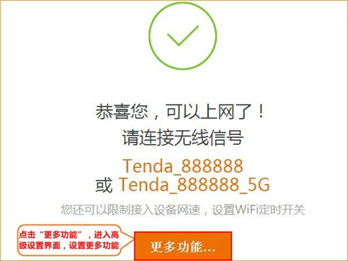 6、“設置完成,路由器正在聯網中,請稍候…”,等待大約10秒鐘后,在跳轉界面點擊“更多功能”,參考如下步驟。