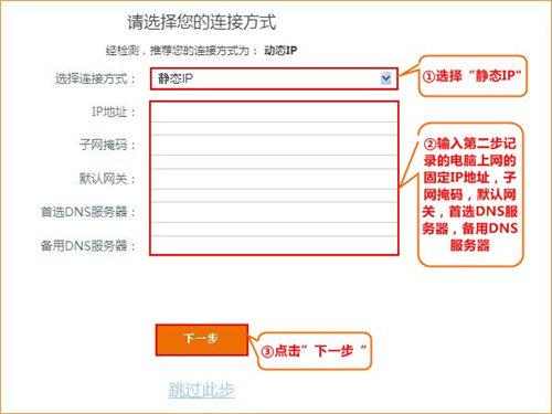 ③靜態連接:在頁面中選擇“靜態IP”,填寫第二步記錄的電腦上網的固定IP地址,子網掩碼,默認網關,首選DNS服務器,備用DNS服務器信息,參考下圖: