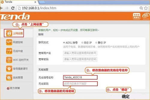 2、點(diǎn)擊“上網(wǎng)設(shè)置”——>在右側(cè)“無線加密”選項(xiàng)下,設(shè)置“無線信號名稱”、“無線密碼”——>點(diǎn)擊“確定”即可。