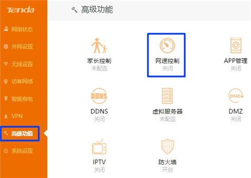 3、在騰達AC路由器的設置頁面,點擊“高級功能”——>“網速控制”——>啟用“網速控制”——>點擊“保存”。
