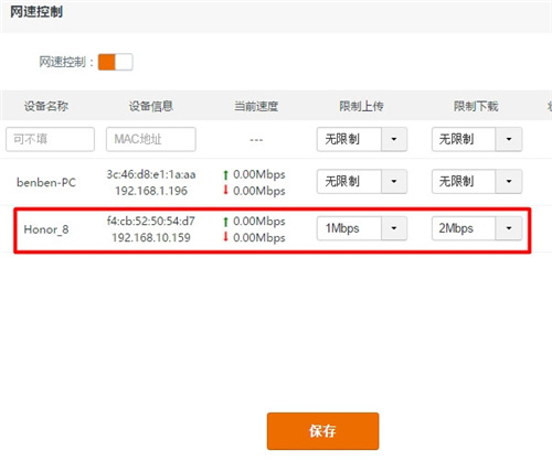 在連接訪客網絡的設備后面,設置“限制上傳”、“限制下載”——>然后點擊“保存”,如下圖所示。