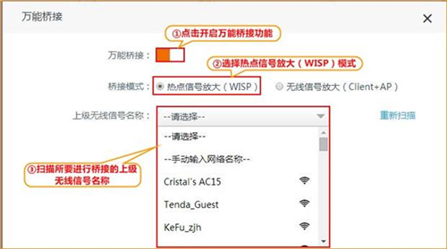 8、開啟“萬能橋接”,橋接模式選擇“熱點信號放大(WISP)”,在設備自動掃描到的無線信號中選擇所需中繼的上級無線信號名稱,并輸入密碼,點擊“保存”參考如下設置步驟: