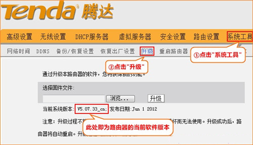 4、點擊“系統設置”-“升級”-“當前系統版本”即為路由器當前的軟件版本信息,根據軟件說明確定路由器的當前系統版本是否可以使用您下載的升級軟件。