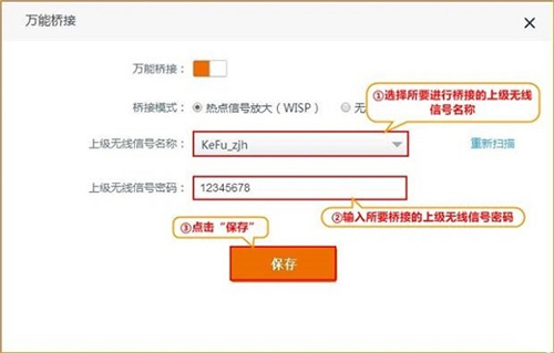 7、開啟“萬能橋接”,橋接模式選擇“熱點信號放大(WISP)”,在設備自動掃描到的無線信號中選擇所需中繼的上級無線信號名稱,并輸入密碼,點擊“保存”參考如下設置步驟