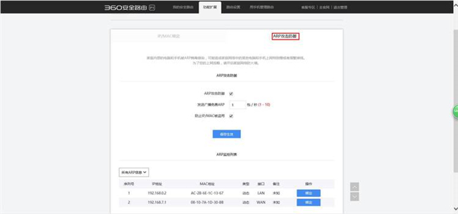 進入到“家庭網絡防火墻”的“ARP攻擊防御”界面。如下圖: