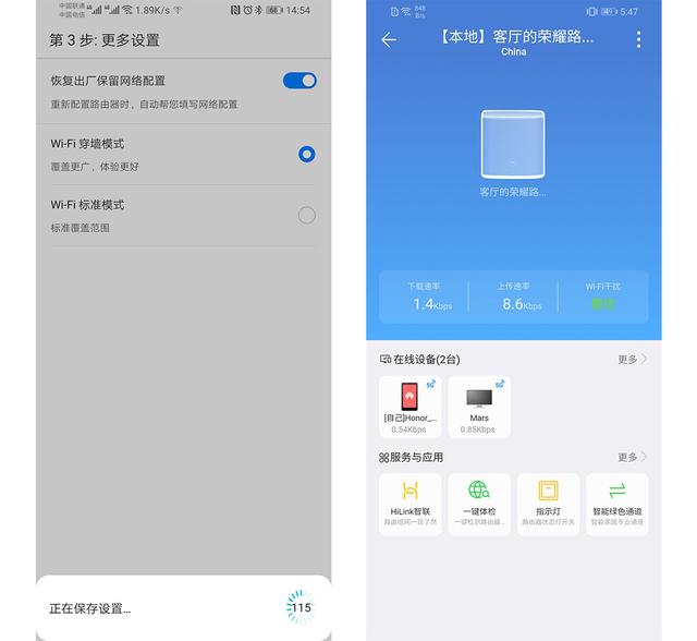 3)就是直接幫你勾選了,恢復一下出廠幫你更純凈的設置你的WIFI網絡,同時你可以選擇穿墻模式或者標準模式,話不多說我當然要穿墻模式呀,選擇好后點擊下面的保存設置,就可以進入榮耀路由APP的軟件主頁面了。一進來就可以看到下載、上傳速率以及WIFI信號。下面為當前在線設備以及連接的信號頻率。