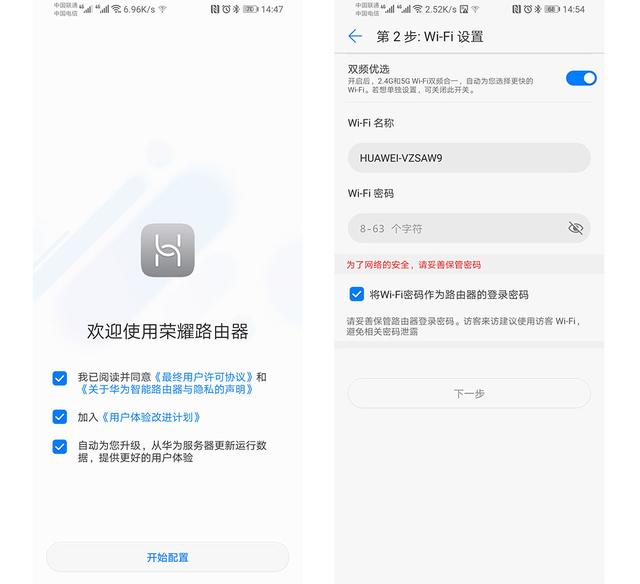 2)進入之后,需要勾選用戶協議和隱私申明這一欄,然后就直接到了第二步設置WIFI名稱和密碼了并能同時設置把WIFI密碼當做路由器管理密碼方便網頁端管理,因為榮耀路由Pro2還是繼承了華為路由器一貫的優秀體驗,支持雙頻優選,再也不用設置5G和2.4G的網了,那個信號好就連那個再也不用為上個廁所還要切換WIFI,而手忙腳亂了。