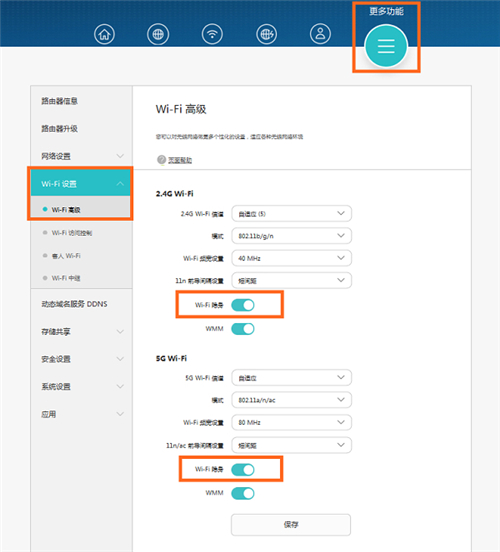 2、“更多功能”——>“Wi-Fi設置”——>“Wi-Fi高級”——>在“2.4G Wi-Fi”選項下,打開“Wi-Fi隱藏”的開關——>繼續在“5G Wi-Fi”選項下,打開“Wi-Fi隱藏”的開關——>點擊“保存”。