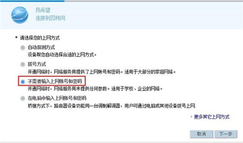 ③不需要輸入上網(wǎng)賬號(hào)和密碼:辦理寬帶業(yè)務(wù)后,在沒(méi)有用路由器的情況下,把寬帶網(wǎng)線(xiàn)連接到電腦就能上網(wǎng)。那么在設(shè)置華為WS550路由器上網(wǎng)時(shí),就應(yīng)該選擇:不需要上網(wǎng)賬號(hào)和密碼——>點(diǎn)擊“下一步”。