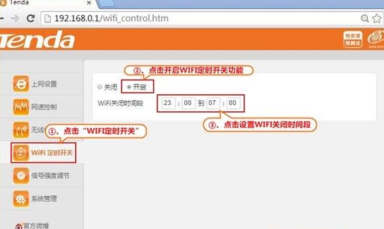 第二步:在路由器左側菜單中點擊“WIFI定時開關”,在打開的頁面中進行相應設置,參考如下操作步驟: