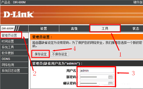2、點擊“工具”——>“管理員設置”——>“用戶名”建議用戶修改——>“新密碼”建議用戶設置字母、數字、大小寫的組合——>“確認密碼”輸入新密碼欄輸入過的密碼——>點擊上方的“保存設定”。