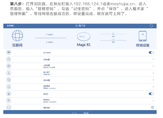 第八步:打開瀏覽器,在地址輸入192.168.124.1或者moshujia.cn,進(jìn)入頁面后,輸入管理密碼,勾選記住密碼,并保存,進(jìn)入魔術(shù)家管理界面,等待網(wǎng)絡(luò)連接成功,即可設(shè)置,現(xiàn)在可以上網(wǎng)了。