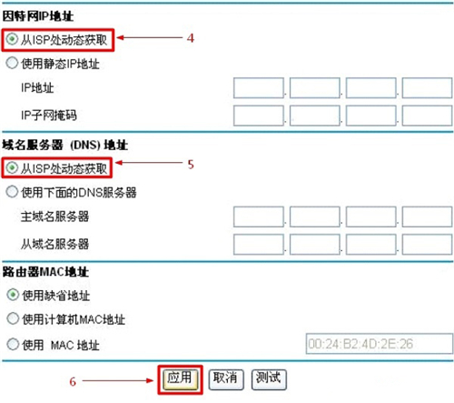 選擇菜單“設置”——>“基本設置”——>“您的因特網連接需要登錄嗎”選擇:否——>“因特網IP地址”選擇:從ISP 處動態獲取——>點擊“應用”如下圖: