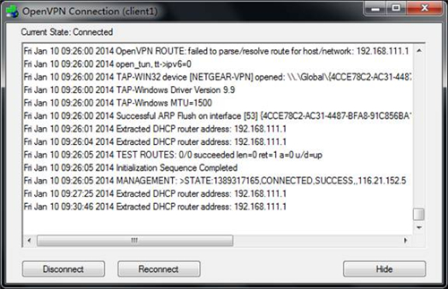 ①通過OpenVPN軟件查看:鼠標懸停在通知區域的OpenVPN圖標上可看到下圖中的信息:
