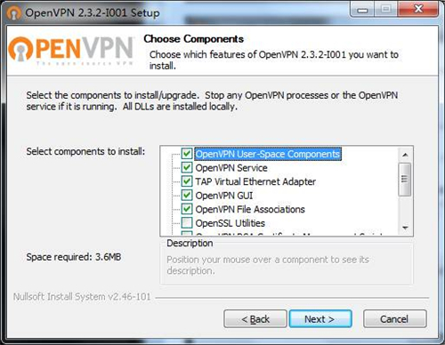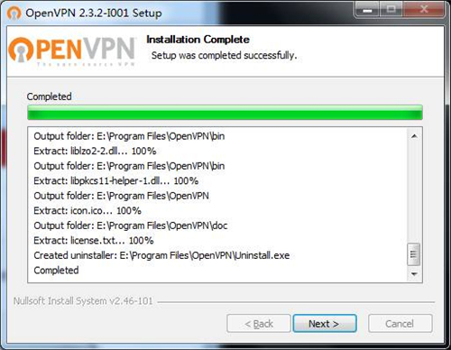 2、安裝OpenVPN,NETGEAR的VPN服務功能是基于OpenVPN的技術實現的,因此,我們要在每一臺需要連接VPN的電腦上安裝部署OpenVPN軟件。訪問http://support.netgear.cn/doucument/Detail.asp?id=2251獲取適用于您的操作系統的OpenVPN軟件,本例中獲取的軟件安裝包為“openvpn-install-2.3.2-I001-i686.exe”。雙擊運行此安裝程序,根據安裝程序提示完成安裝: