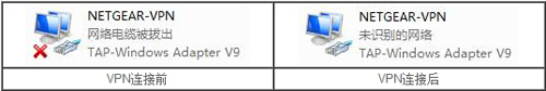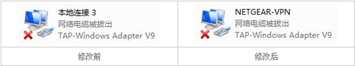 X代表一個數字編號,具體為多少取決于您的計算機上已經有多少個相類似的網絡適配器,我們需要找到的是設備名稱“TAP-Windows Adapter V9”的圖標,在這個圖標上點擊鼠標右鍵,然后點擊重命名修改此連接名稱為“NETGEAR-VPN”。
