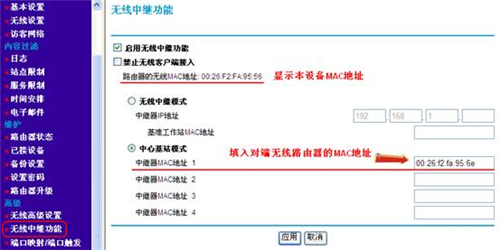 ②選擇“無(wú)線中繼器”模式,在“基站MAC地址”中,填入路由器A的MAC地址;