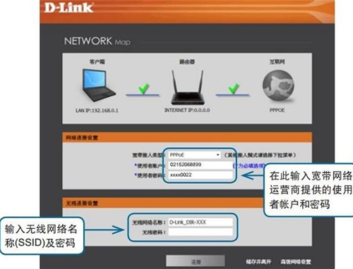 這時候在設置DIR629路由器上網時,“寬帶連接類型”就應該選擇:PPPoE——>然后填寫寬帶運營商提供的寬帶賬號、寬帶密碼——>自定義設置“無線網絡名稱”、“無線密碼”——>點擊“連接”。