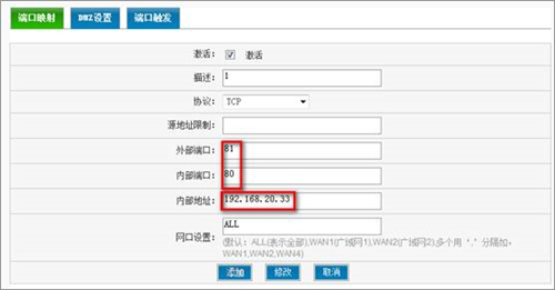 3、做端口映射,將192.168.20.33的80端口映射到外網的81端口。