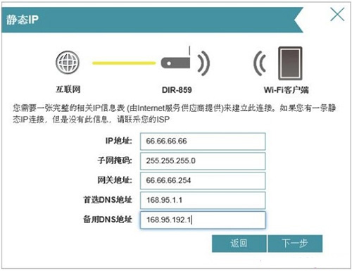 然后填寫寬帶運(yùn)營商提供的靜態(tài)IP地址、子網(wǎng)掩碼、網(wǎng)關(guān)和DNS——>點(diǎn)擊“下一步”。