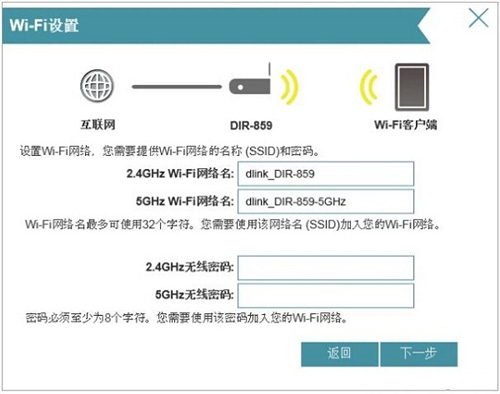 6、設(shè)置/修改DIR859路由器中的2.4G和5G無線網(wǎng)絡(luò)的,無線名稱、無線密碼——>點(diǎn)擊“下一步”。