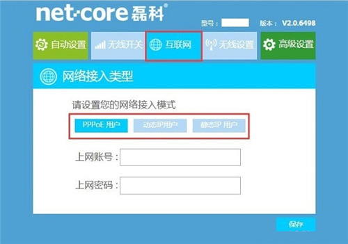 6、點擊“互聯網”,然后會看到“網絡接入類型”頁面,在該頁面下有:PPPoE用戶、動態IP用戶、靜態IP用戶 3個選項,如下圖所示。