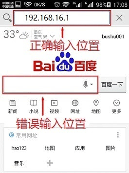 (1)、有些手機瀏覽器的主頁有一個搜索框(百度、360、搜狗、UC等等),很多用戶習慣在搜索框中輸入192.168.16.1。這里需要說明一下,在搜索框中輸入192.168.16.1是錯誤的,是不能登陸到192.168.16.1頁面的。