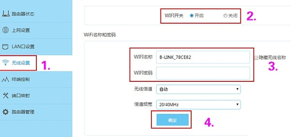 點擊“無線設置”——>“WiFi開關”選擇:開啟——>然后設置“WiFi名稱”、“WiFi密碼”——>點擊“確定”。