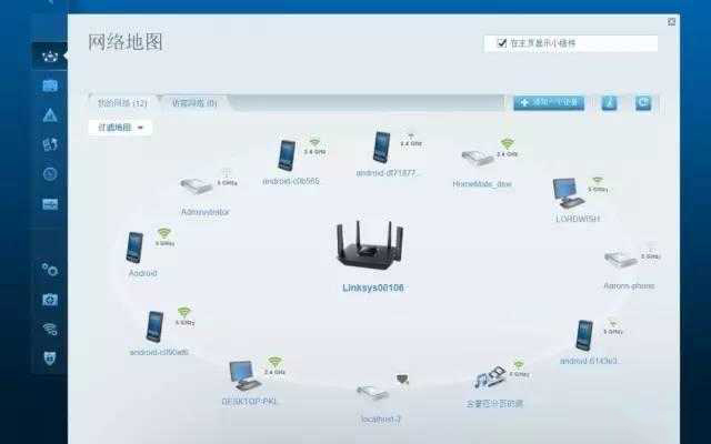 WEB端管理頁面與手機APP的差異主要有四個地方,一是加入了網絡地圖的功能,以圖標的形式來直觀的顯示當前的連接設備類型,同時可以快速的通過篩選不同類型的設備進行管理,同時可以標識出當前的聯網方式以及對應的WiFi信號強度。
