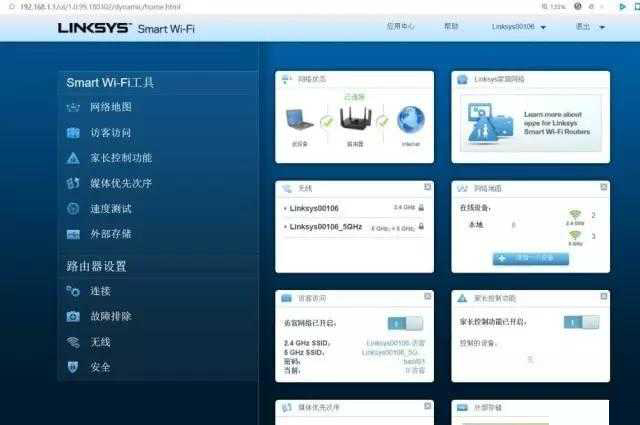 下面是WEB端設置頁面中的主要功能畫面,左側為主要功能和設置列表,分類上較為清晰,加入了常見的家長控制功能和訪客網絡,訪客網絡默認為開啟狀態,但有默認采用加密設置,不過在黑名單的管理上有些不方便操作。右側則為八個功能模塊的狀態顯示圖,可以直觀的了解到當前的設備連接和設置情況。