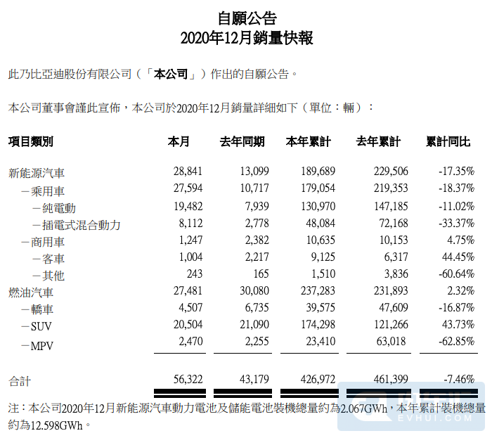比亞迪:12月新能源銷售2.88萬輛 全