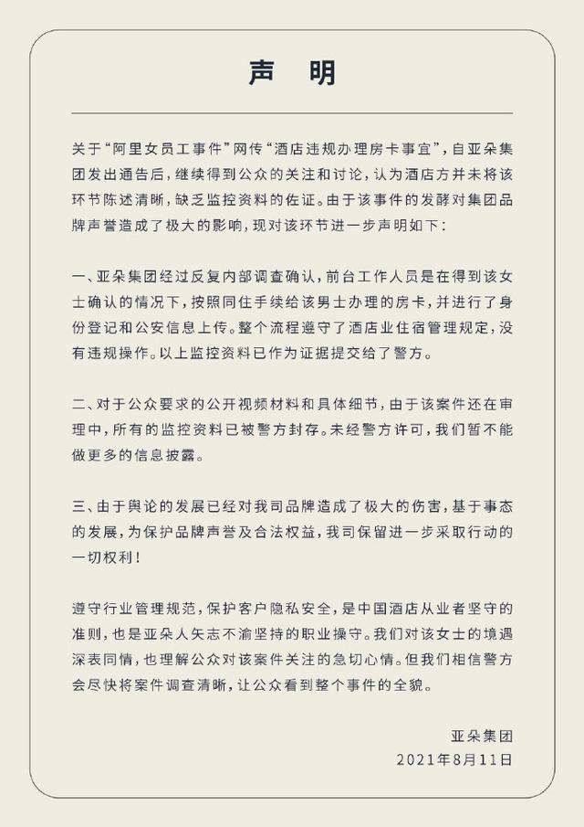 亞朵再回應(yīng)“阿里女員工事件”:男子