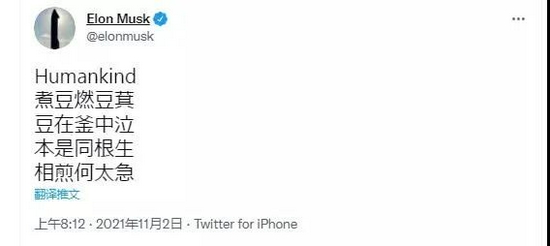 馬斯克發(fā)中文七步詩(shī):Humankind 煮豆