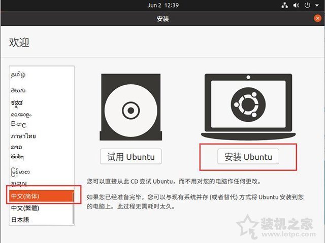 進(jìn)入到U盤(pán)中,我們就可以看到烏班圖Ubuntu系統(tǒng)安裝的界面了,我們選擇“中文簡(jiǎn)體”,點(diǎn)擊“安裝Ubuntu”。