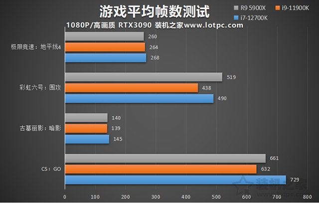 游戲表現上,intel酷睿i7 12700K在各大游戲中的表現全面領先于上一代酷睿i9 11900K,并且碾壓R9 5900X,在測試的四款游戲中,R9 5900X只有彩虹六號:圍攻這個游戲占有上風,這次的12代CPU的游戲性能提升絕對沒話說。
